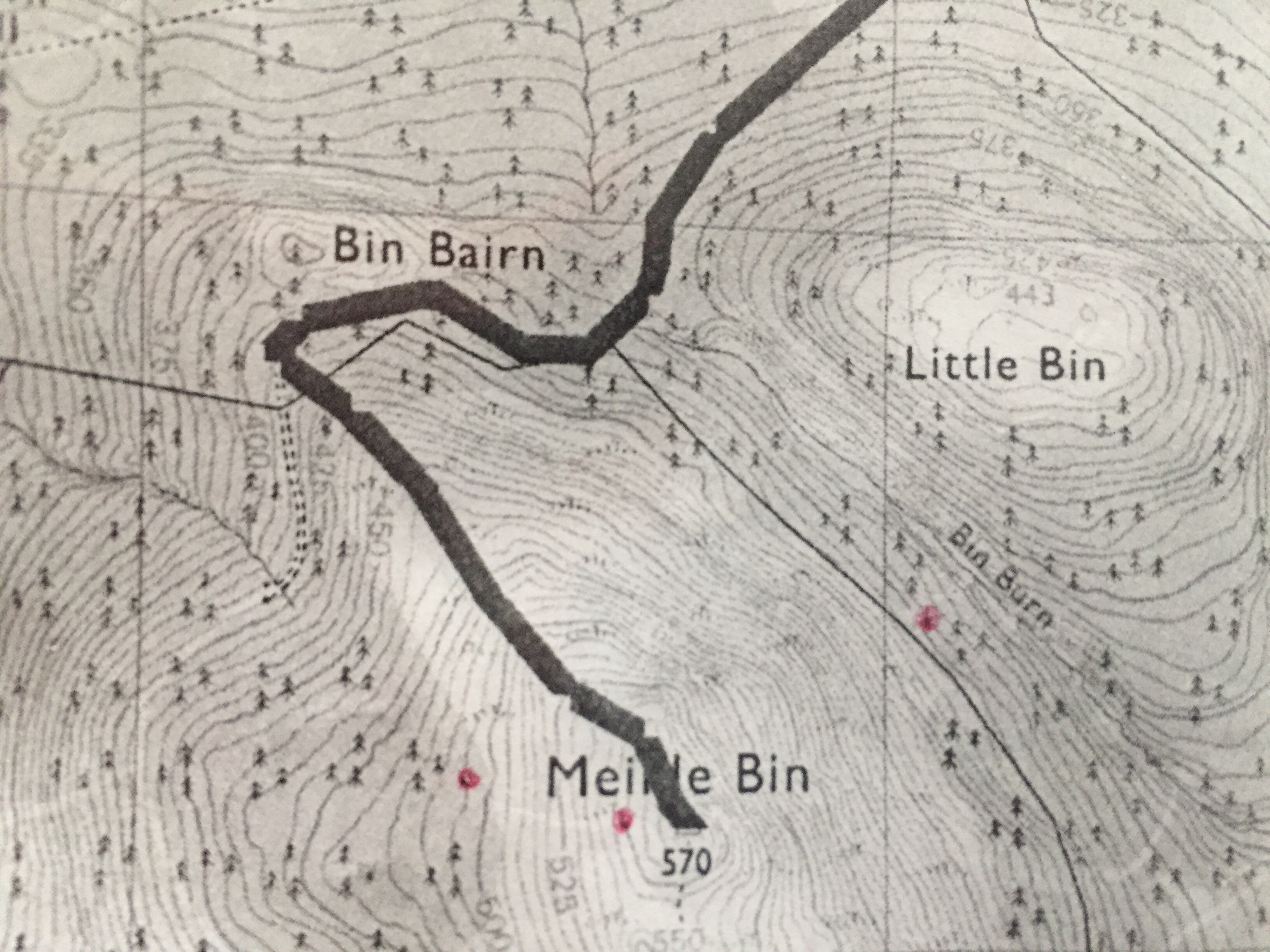 My first microadventure of 2020 took Neil and I to Meikle Bin (you might notice the hill isn’t on my planned list…….). The weather looked awful (and was) but it was to be a quick trip up and down, with our ultimate aim being to blow the cobwebs of Christmas excess away, as well as find the wreckage of an old aircraft which crashed in the area almost 70 years ago to the day. Read more about the Fairley Firefly here. The red dots below show where the plane pieces could be found,