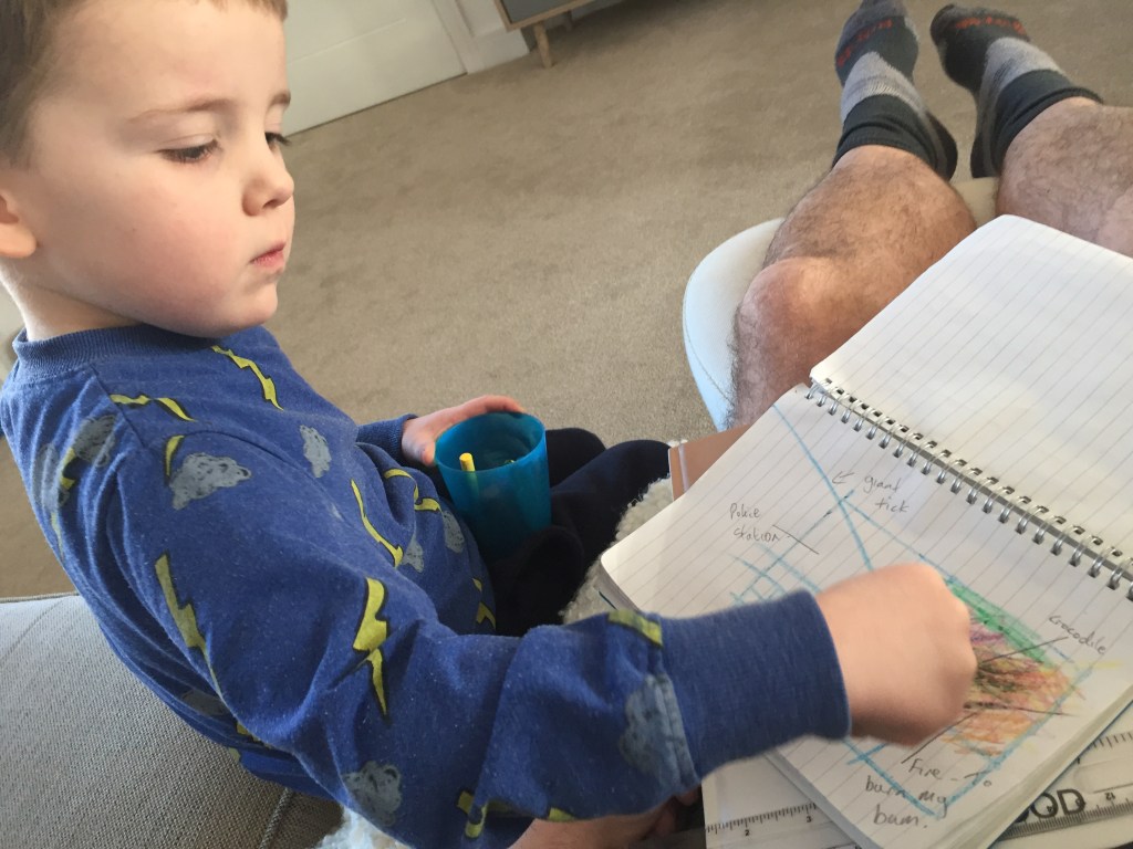 Drawing his plan with him was probably the most fun I’ve had in months. He was articulate, engaged and full of very funny ideas about what would make Bernie the perfect mini camper. The teacher in me liked the giant tick and hoped it wasn’t a blood sucking version. Including a fire to burn me on the bum when I least expected it was a typical Young Johnston thing to say, but in this context it really tickled my funny bone.