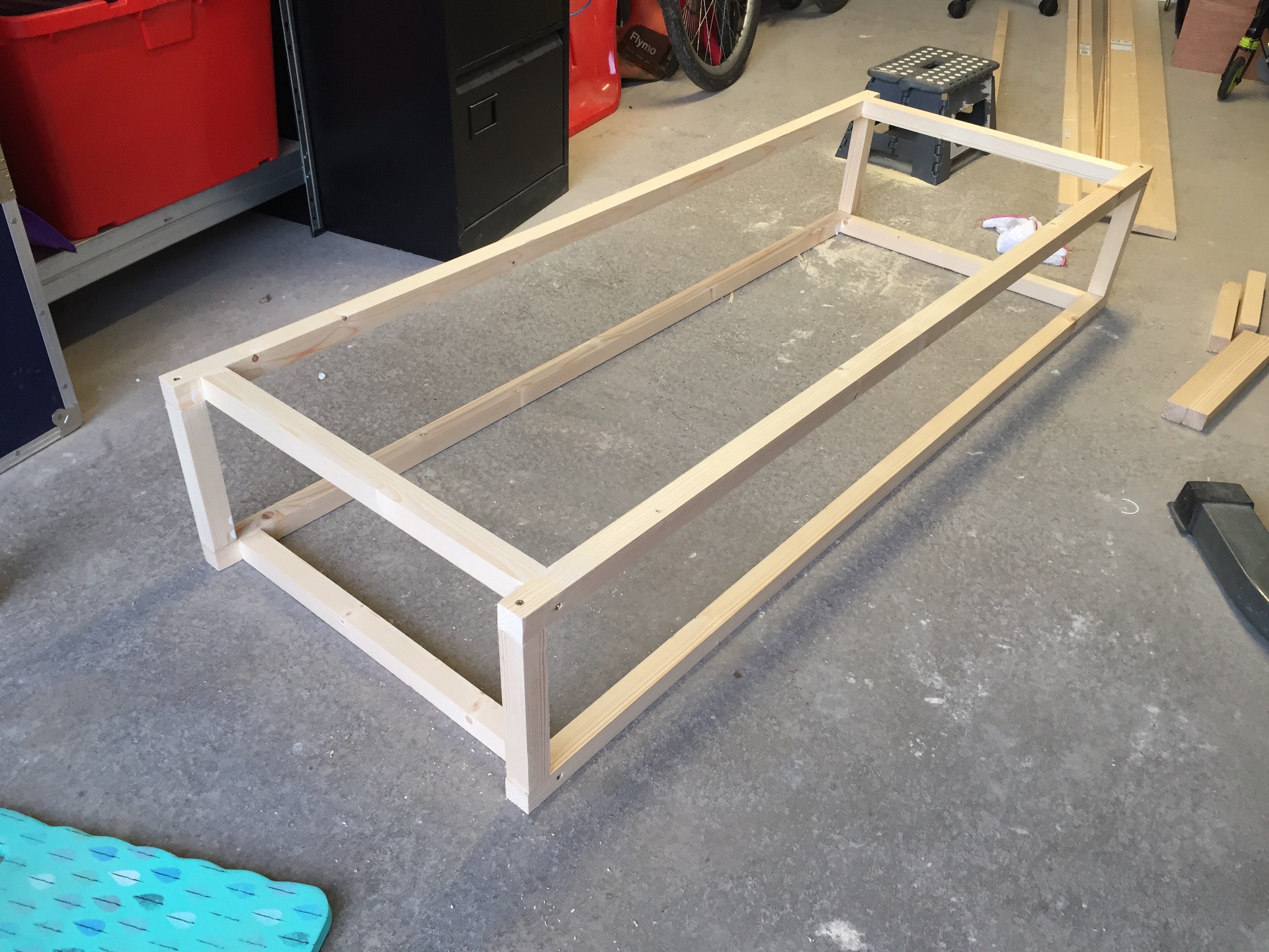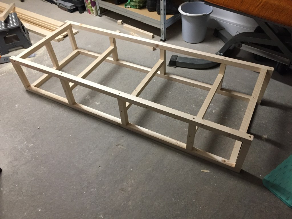 With my measurements in hand I bought all the timber and bits that I thought I needed and set to work. I’d seen one film on YouTube that was my guide as I set off, cutting lengths of planed pine and screwing them together to create a basic frame, with added wood glue for extra muscle.