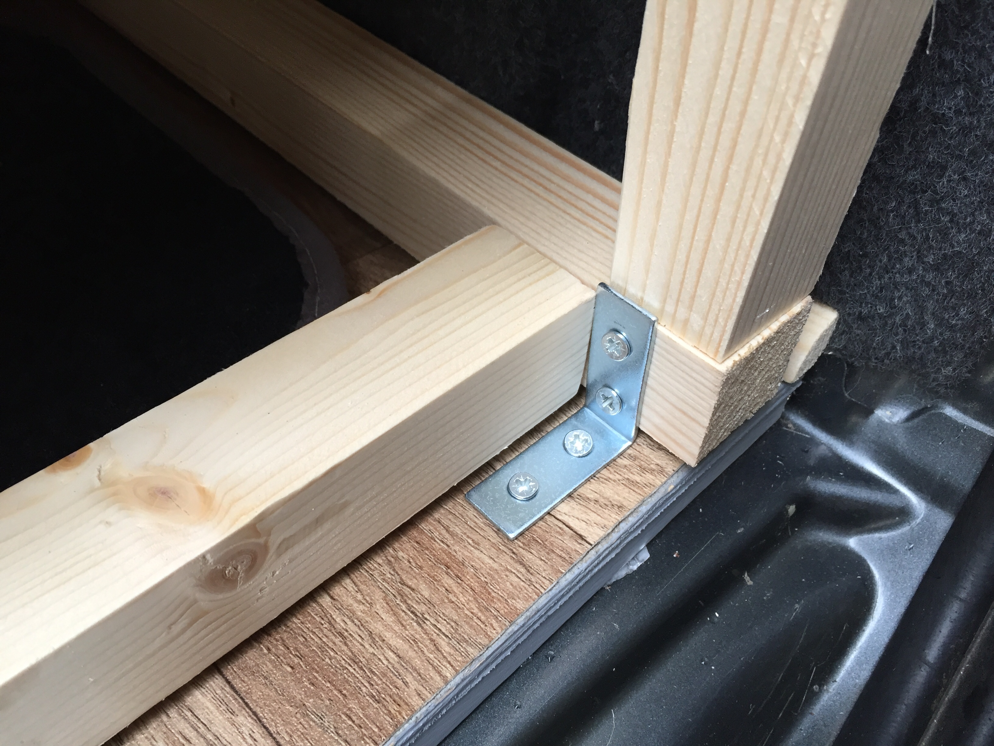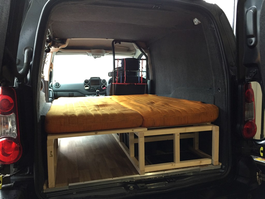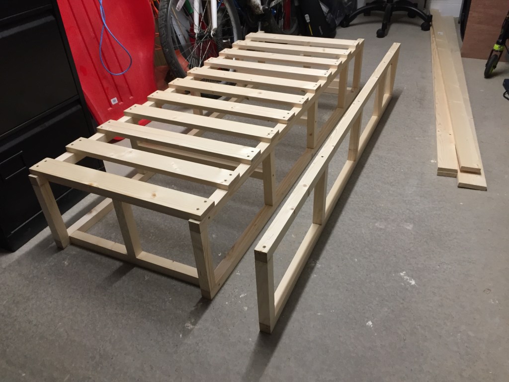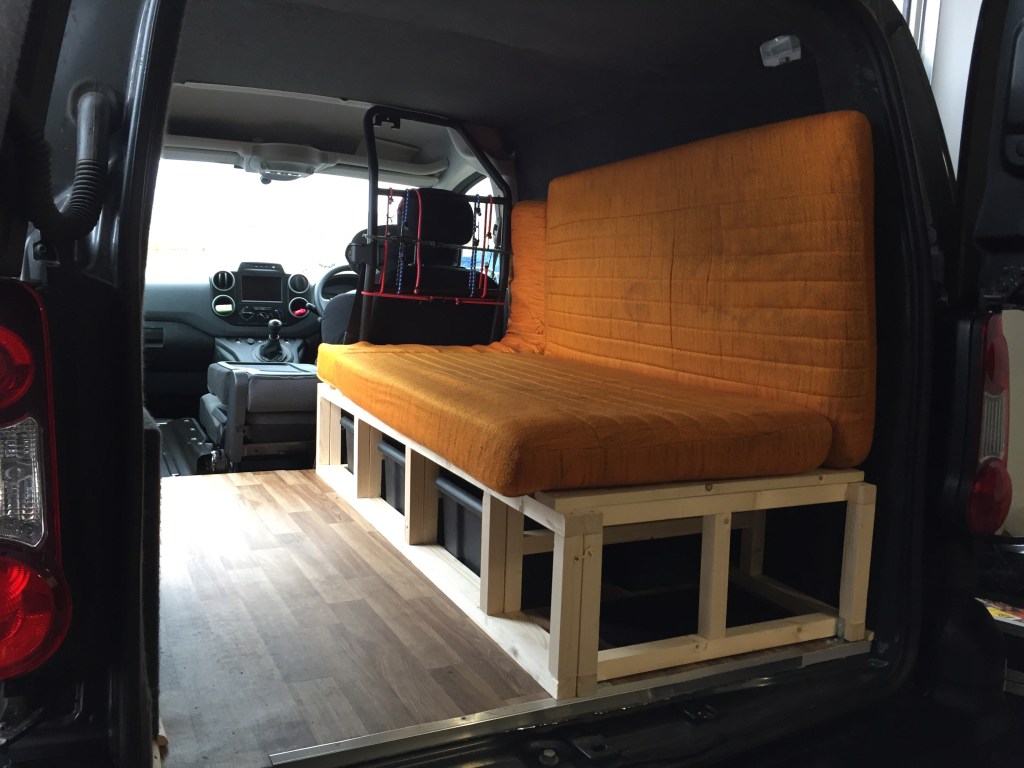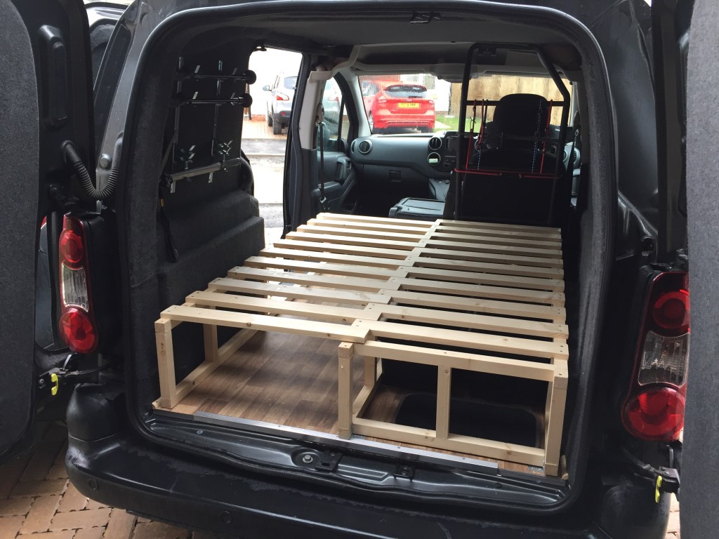 You’ll notice two slats are missing. My calculations for what I would need were just ever so slightly wonky. Unlike the final frame! Which I’m pretty proud of. The final test was to make sure it would fit in the van, which it did.