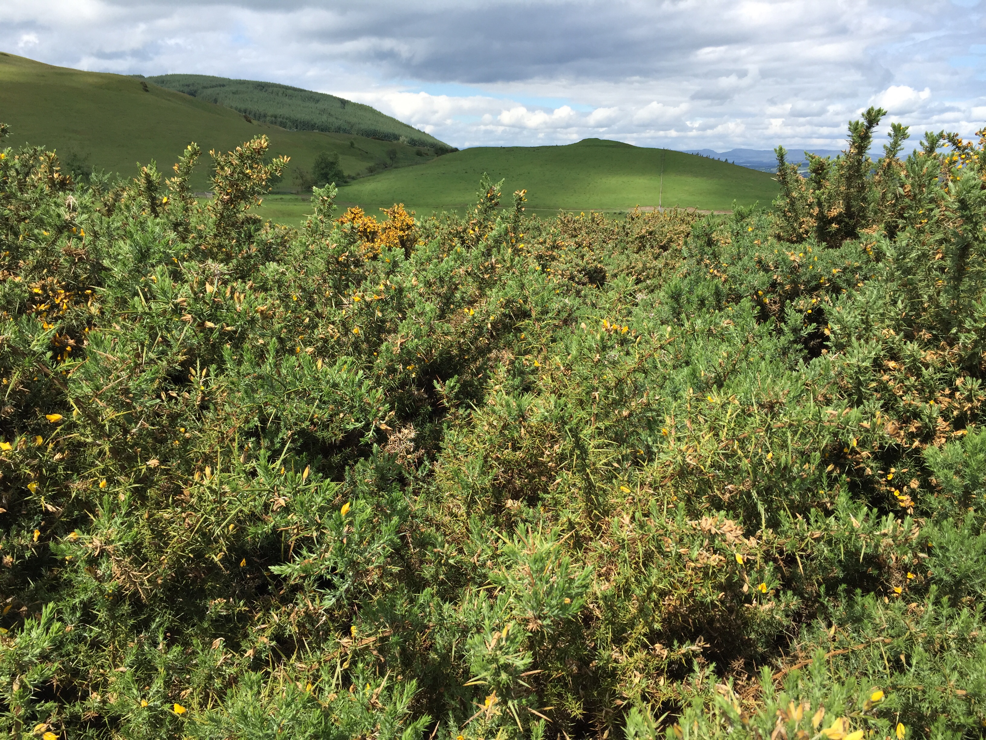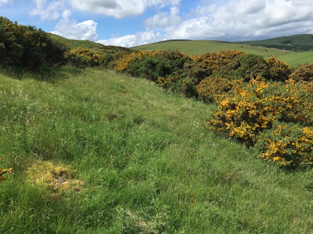 My yellow nemesis had returned, in the same way the Daleks kept popping up to foil Dr Who’s plans. And when I looked up I could see where I needed to get to, just west of the point in front of me in the picture below. But I could find no way around or through the thick, spiky gorse bushes. As you’ll see from the map of my final route at the bottom of the post, I trailed a long way off course trying to find a way through the heavy gorse blanket.