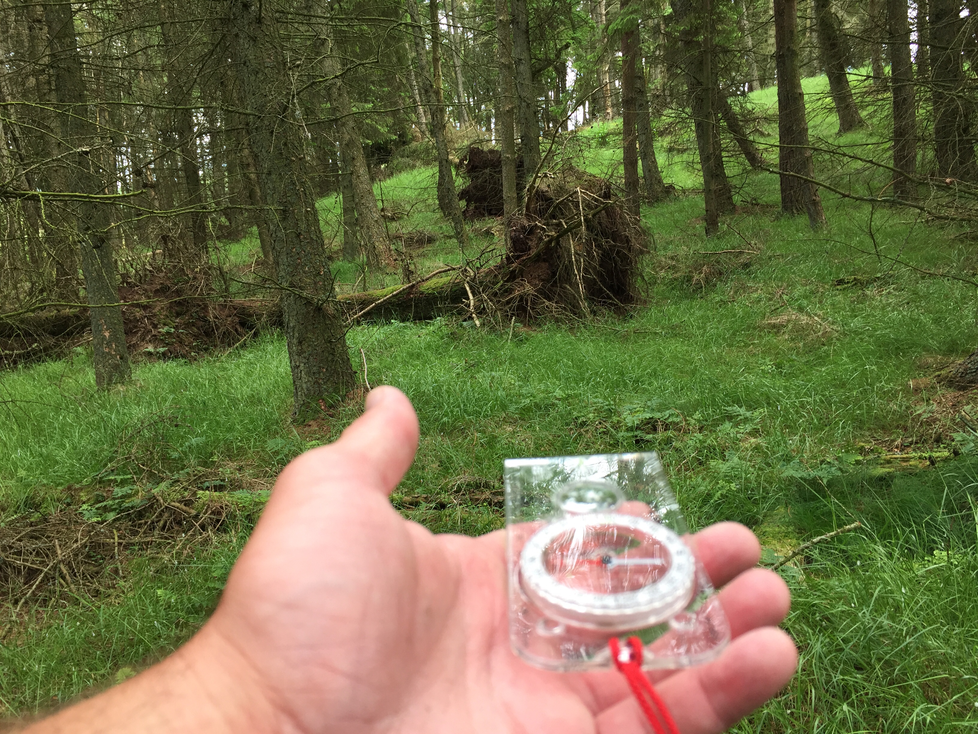 I stopped after completing my planned steps, a wee bit short of the trees. And it was clear from the map I hadn’t reached the north west corner of the square. This left me in a bit of a quandary. I knew I wasn’t at the corner of the square, I could see that from the trees (although it’s always possible that the trees are marked on the map incorrectly) and the height measurement I checked on my phone. But if I was on a hill where I couldn’t see anything, I’d have to rely on my skills without the benefit of sight.