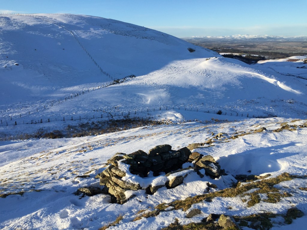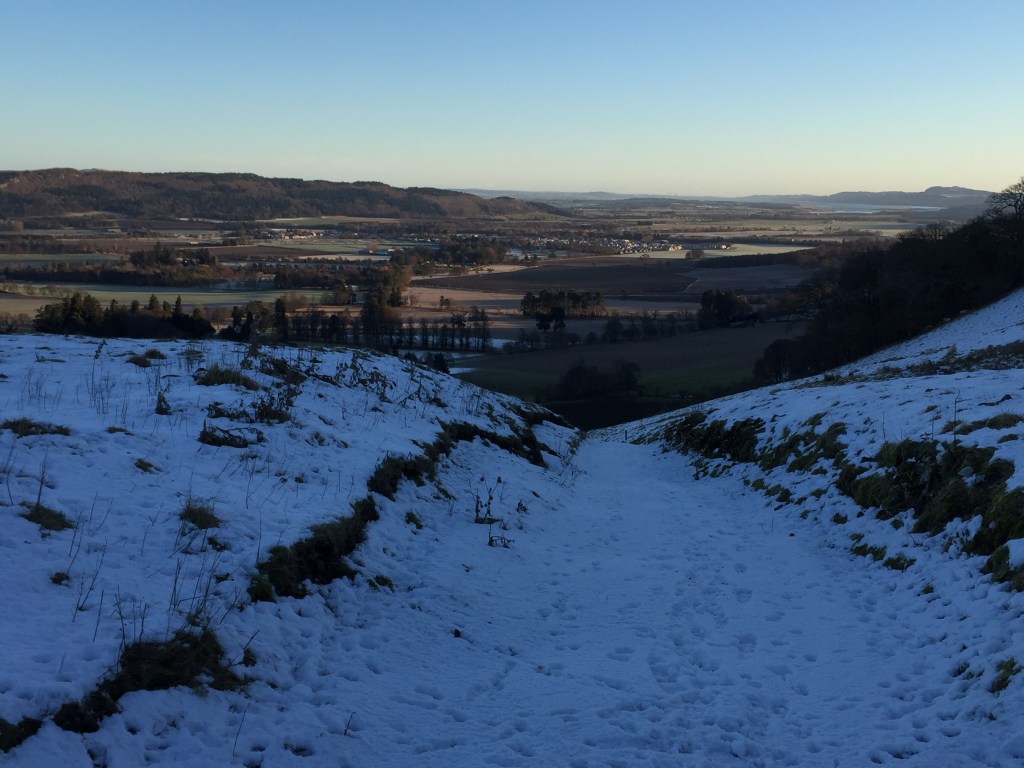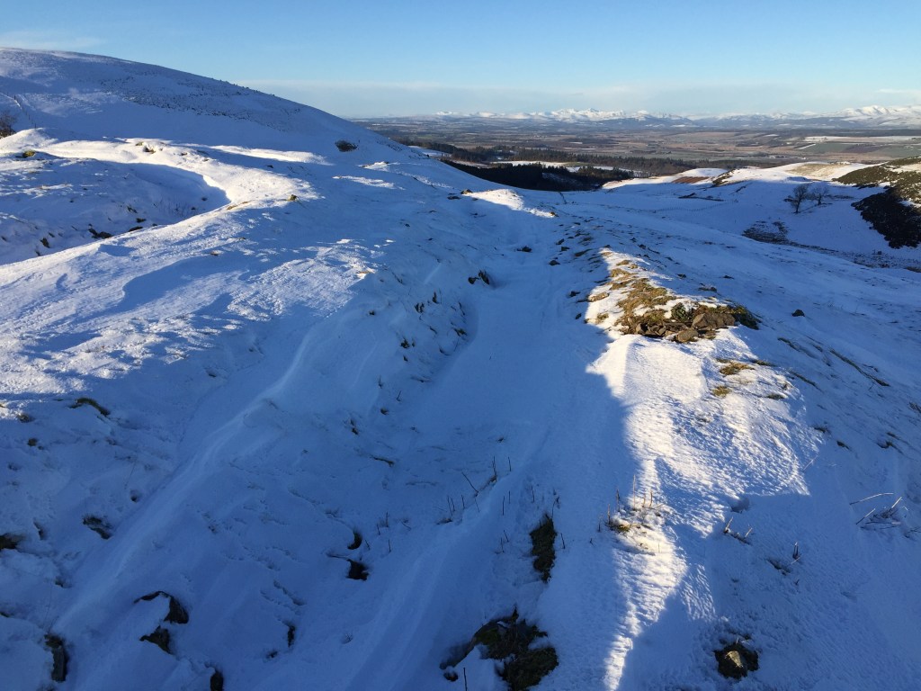 I passed the snow line and was slightly disappointed at what lay on the ground, you can’t craft snowballs out of powder. The views improved with every step looking west toward Ben Chonzie and back toward Bridge of Earn.
