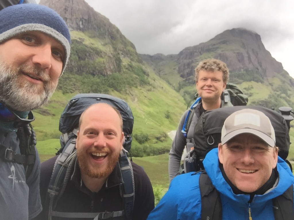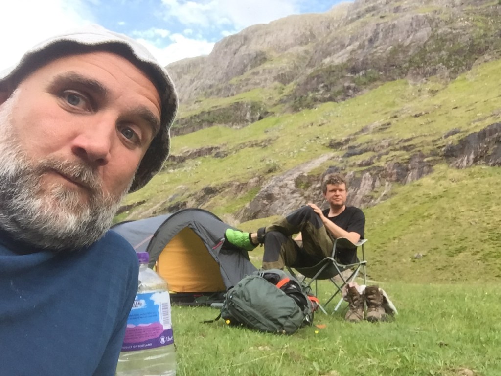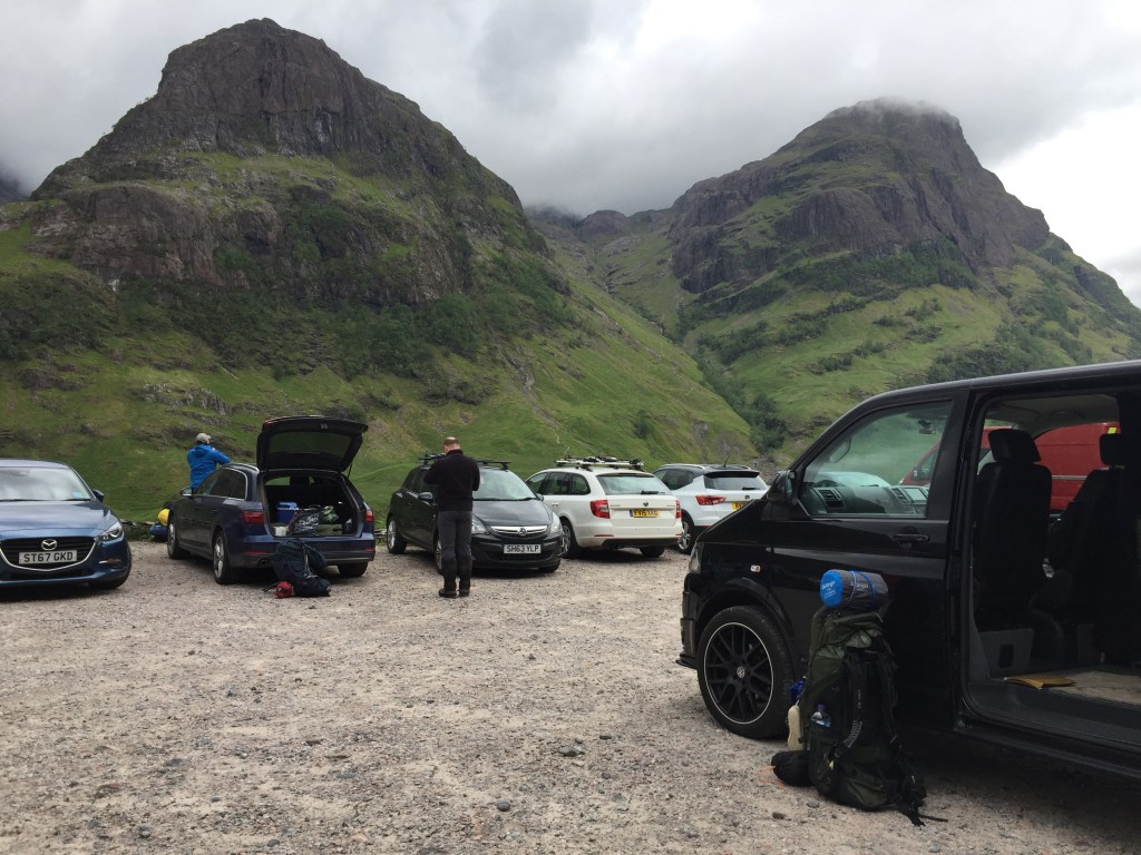 Along with Paul, James and Gav, I found myself in the big car park opposite the Three Sisters, a phenomenal viewpoint even if going no further than the low wall that surrounds the car park. But we were ready to go further. Four big kids full of excitement at where we were heading with our tents and our whisky.