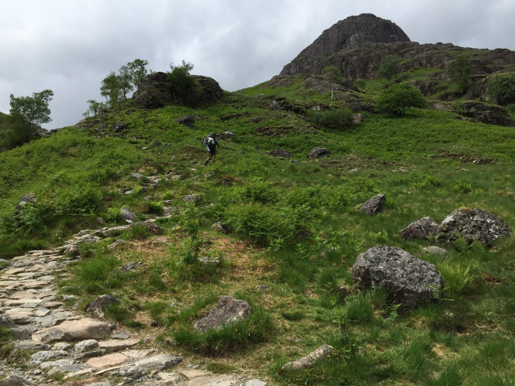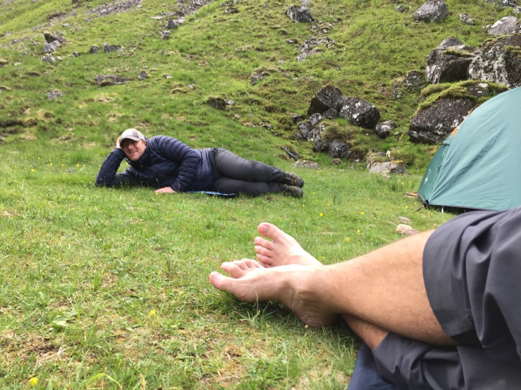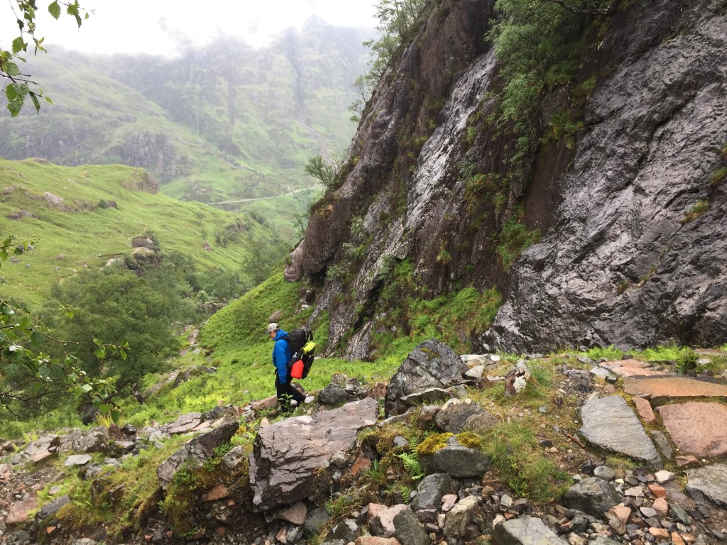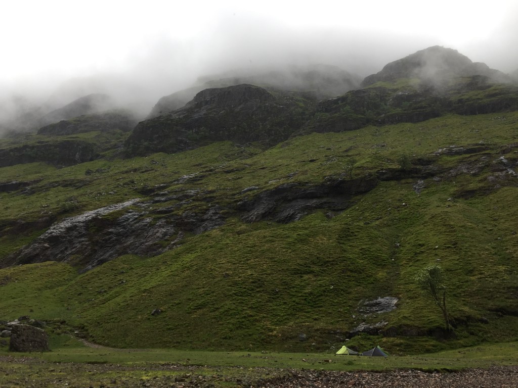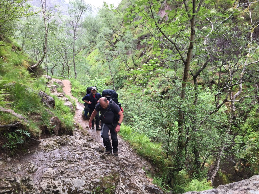 The next day was very wet with an extra large dose of midgies. We quickly ate some breakfast (our first), decamped and headed back the now much slippier stone path towards the bottom of the corrie and the car park.