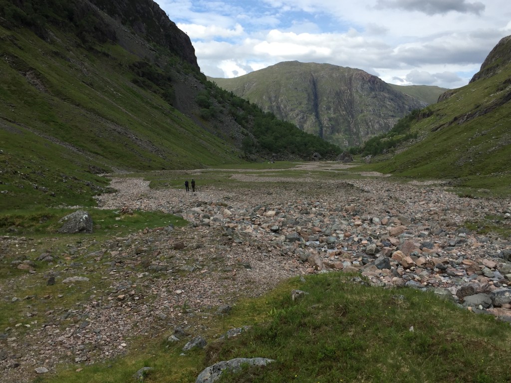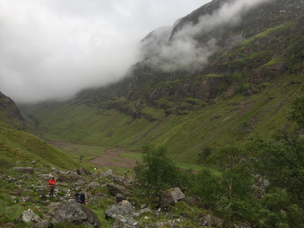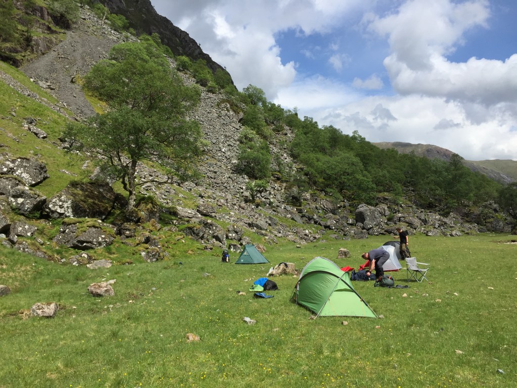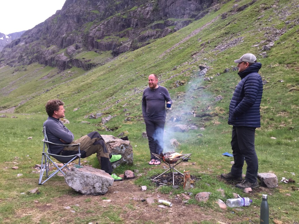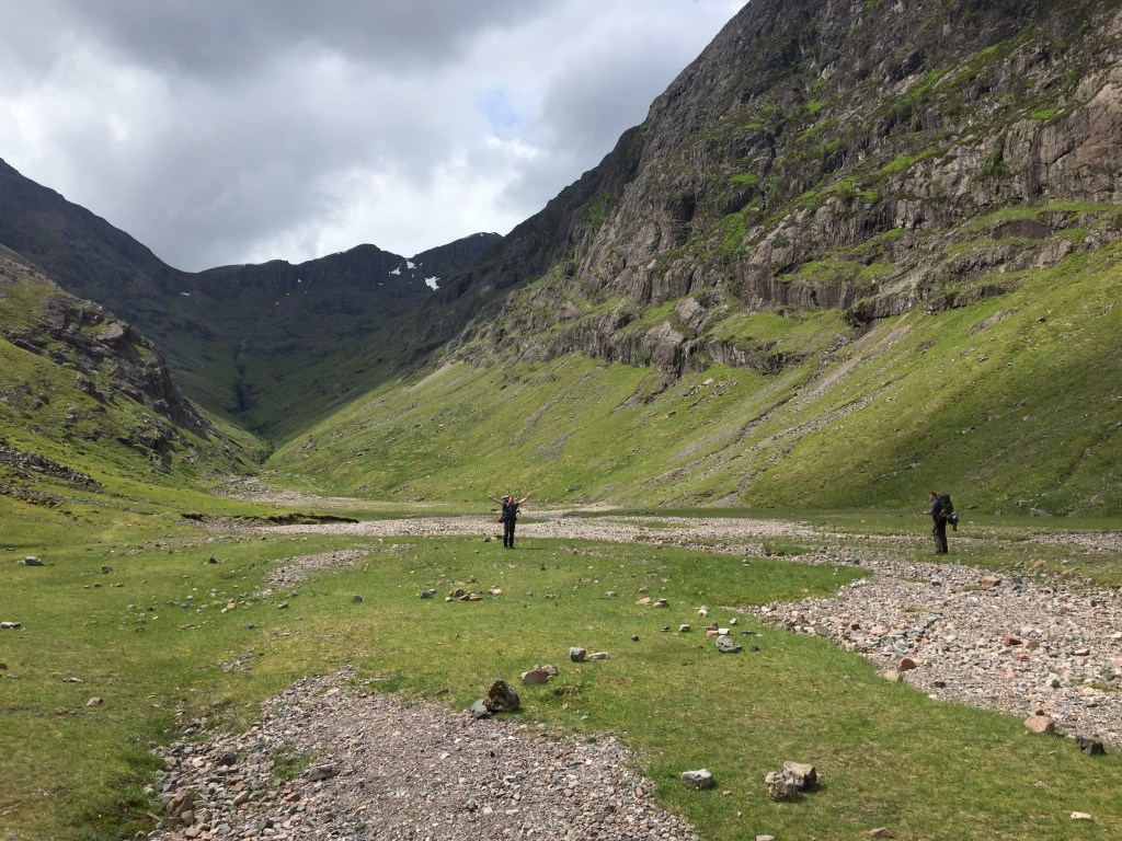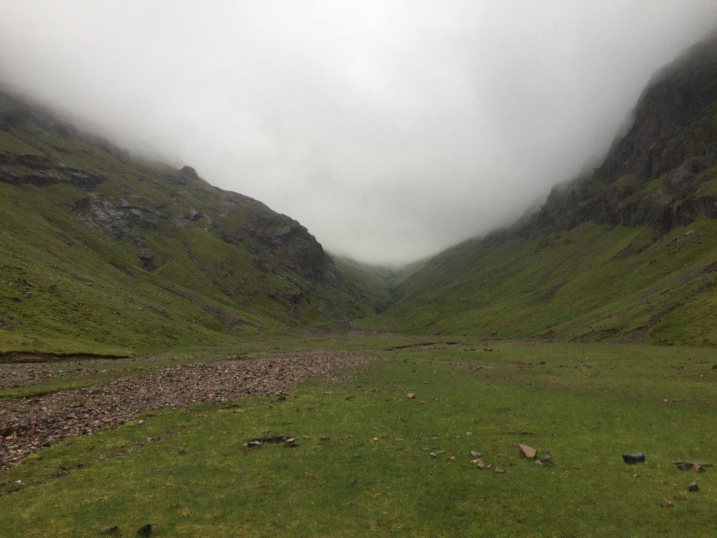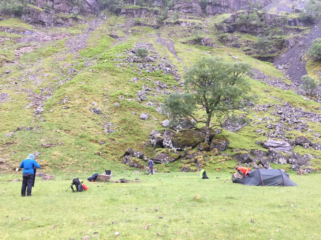 As a venue for a camp, the valley is beautiful. High mountain cliffs on three sides and a flat floor with a mix of stones and grass. The Allt Coire Gabhail flows clear and fast at either end, although curiously disappears in the valley itself. Camp was set up and we ate lunch.
