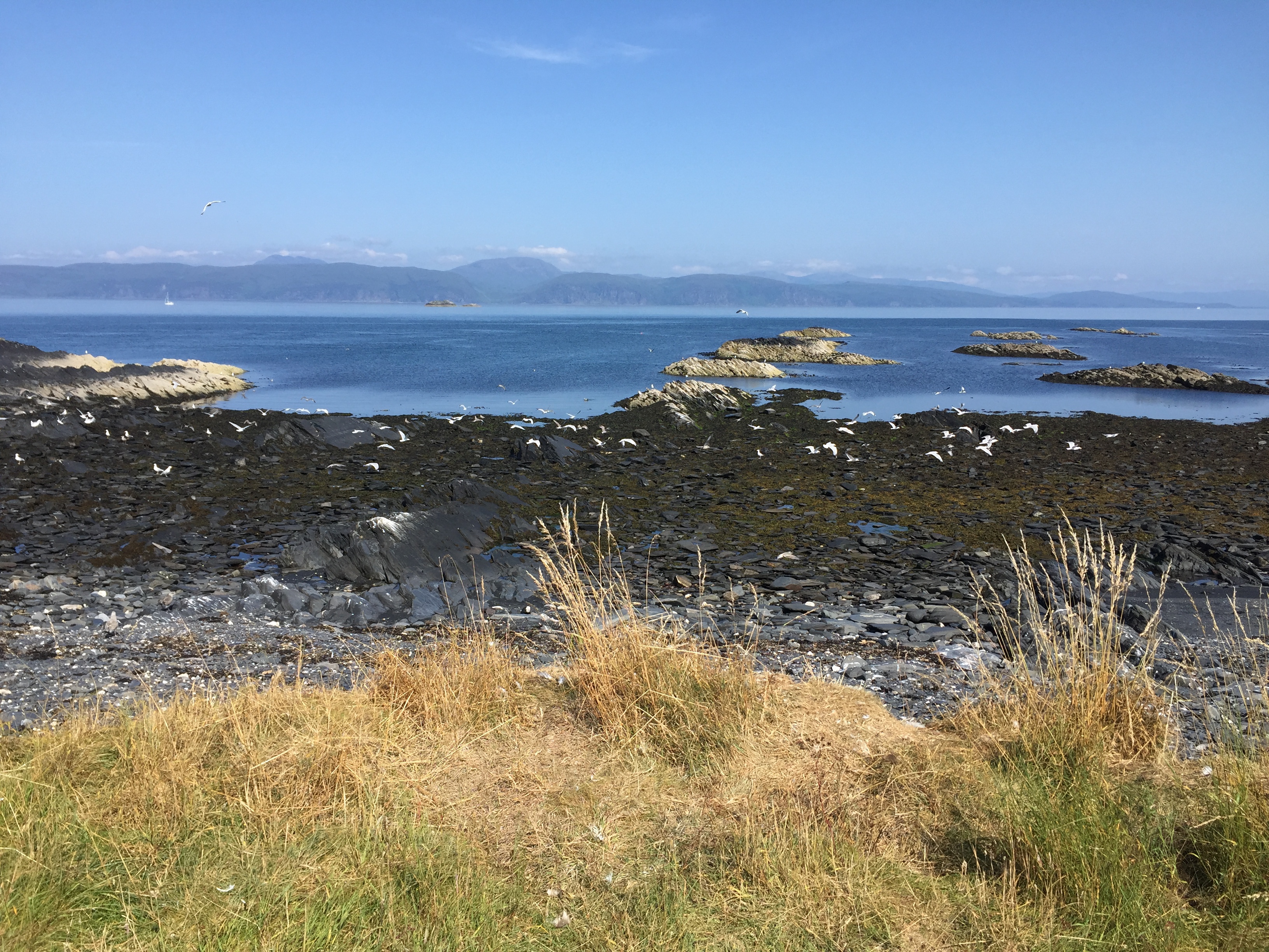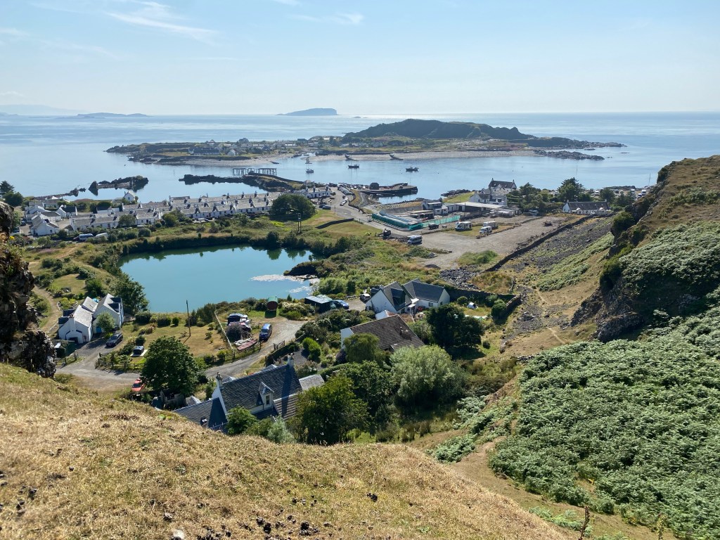 From the village you can see the Slate Islands as they stretch south over the Firth of Lorne. We went higher to get a better look. If you look near the top left of the photo below, you can see two islands, one in front of the other. The one at the front, that looks a bit like a submarine, is Belnahua.