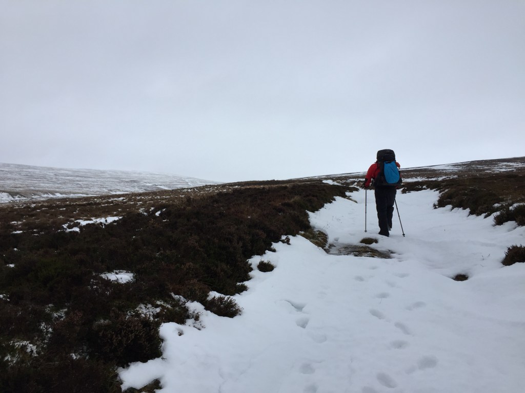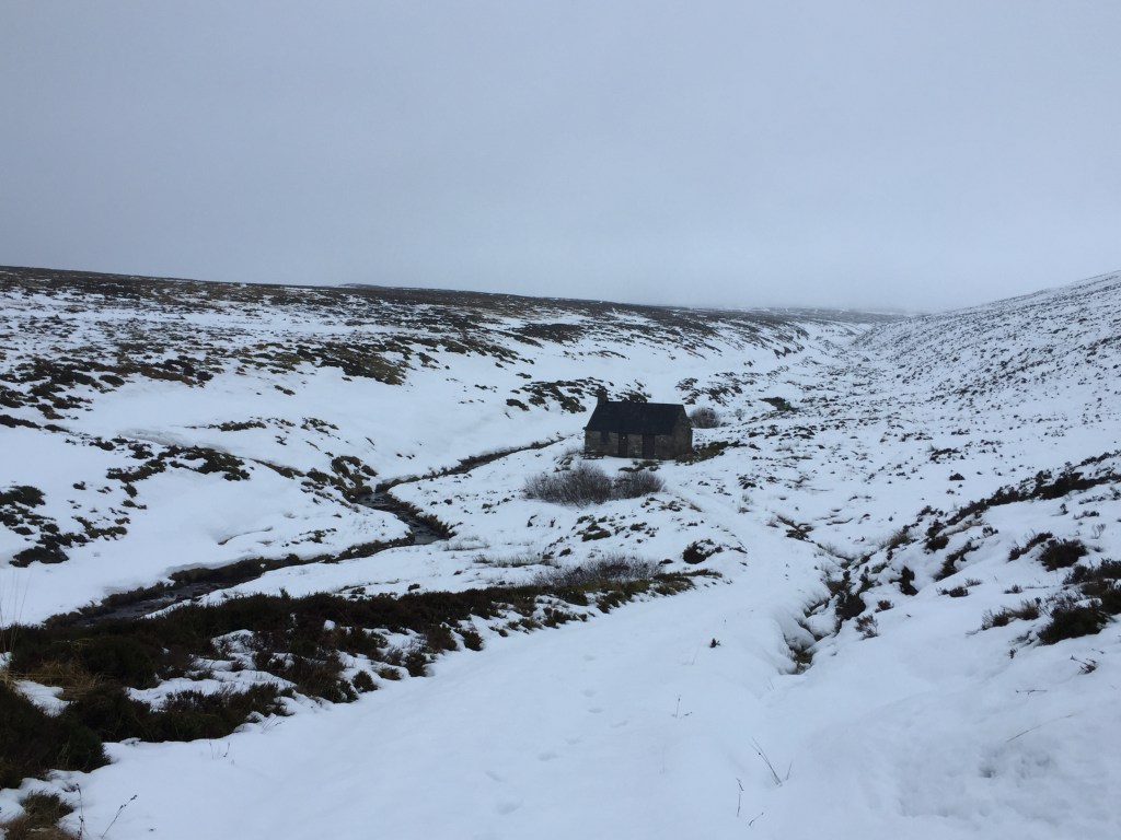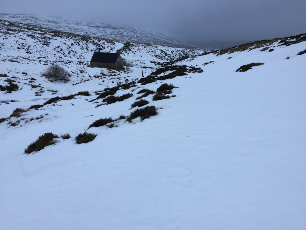 The cold and accompanying breeze meant little time to stop and enjoy our surroundings. I’ve been up to this bothy a few times now, but the landscape had never looked so monochrome, other than the roaming red dot of Gav’s waterproofs.