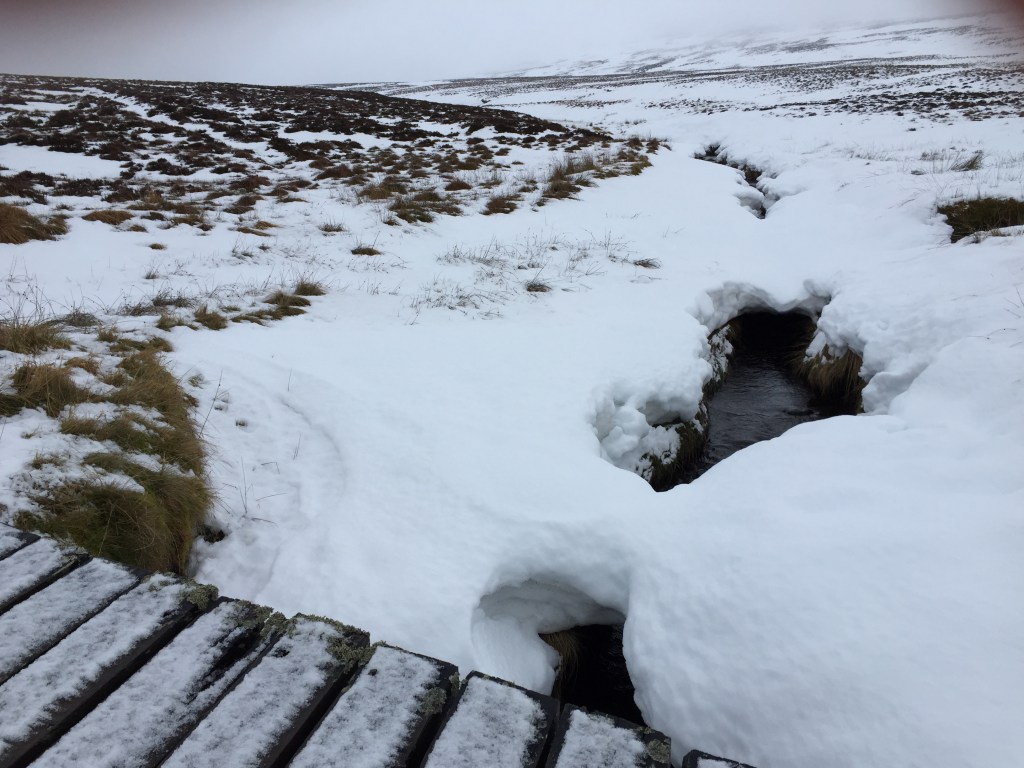 We cleared the woods and we walked higher into the open moors. Quite slowly, as the track was quite snowy where the white stuff had drifted across it. Soft and deep in places, hard and flattened in others, but more often the former, making heather jumping a quicker and more energy efficient way of moving forward.