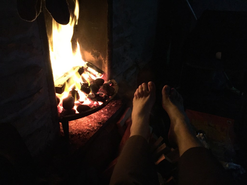 Sunset was due at 3.30pm and the three of us hunkered down and got the fire going. A hot chocolate and some flames soon warmed our soaking wet feet. Sam had brought wood too so we had fuel aplenty to last the night.