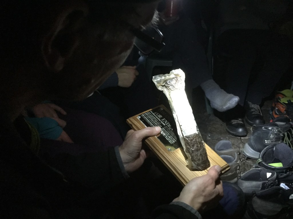 After speaking to a few of the big group, it turned out they were on their yearly outing. Two outdoor groups who travelled Scotland and the world searching for adventure. Each year they gathered in a bothy and celebrated their “endeavours” through the giving of an award, the Tomaselli Salami, named after the Via Ferrata route I mentioned earlier. You can see the trophy below.