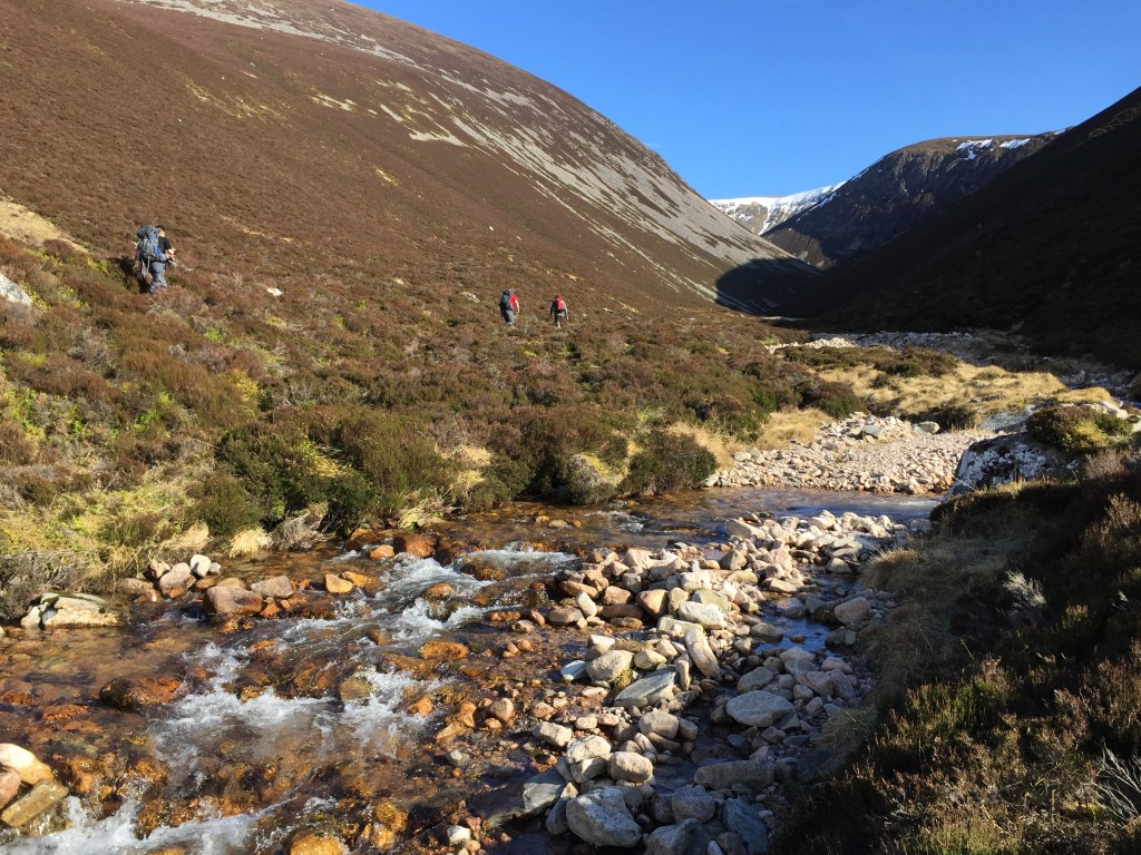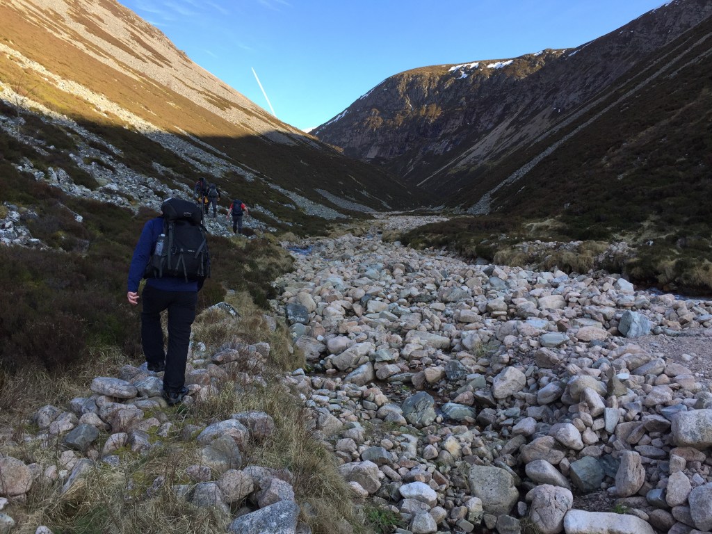 Coire Garbhlach starts out as a wide, rocky mess, the remnants of winter storms gone by (e.g. Storm Desmond). The Allt Garbhlach quickly narrows as it heads east but it’s clarity is obvious from its confluence with the River Feshie.