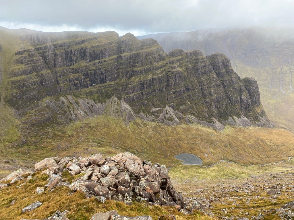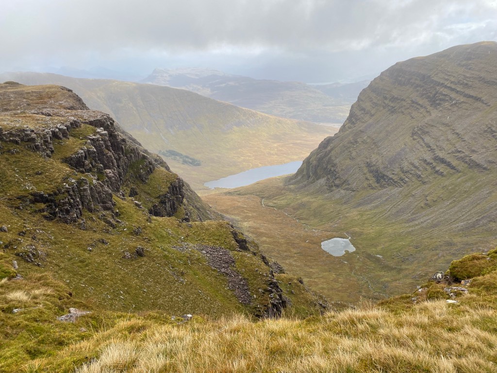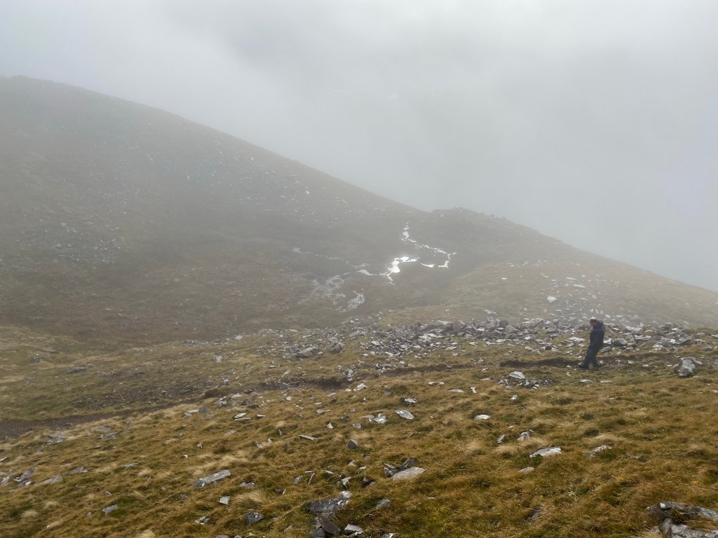 The sun that shone on the way up the corrie road had been totally obscured by the cloud by the time we reached the top of the pass and parked for a wander up Sgurr a Chaorachain. The cloud followed us, blown at high speed by the wind, as we stepped along the start of the ridge. Glimpses of what was to be found on either side were short.