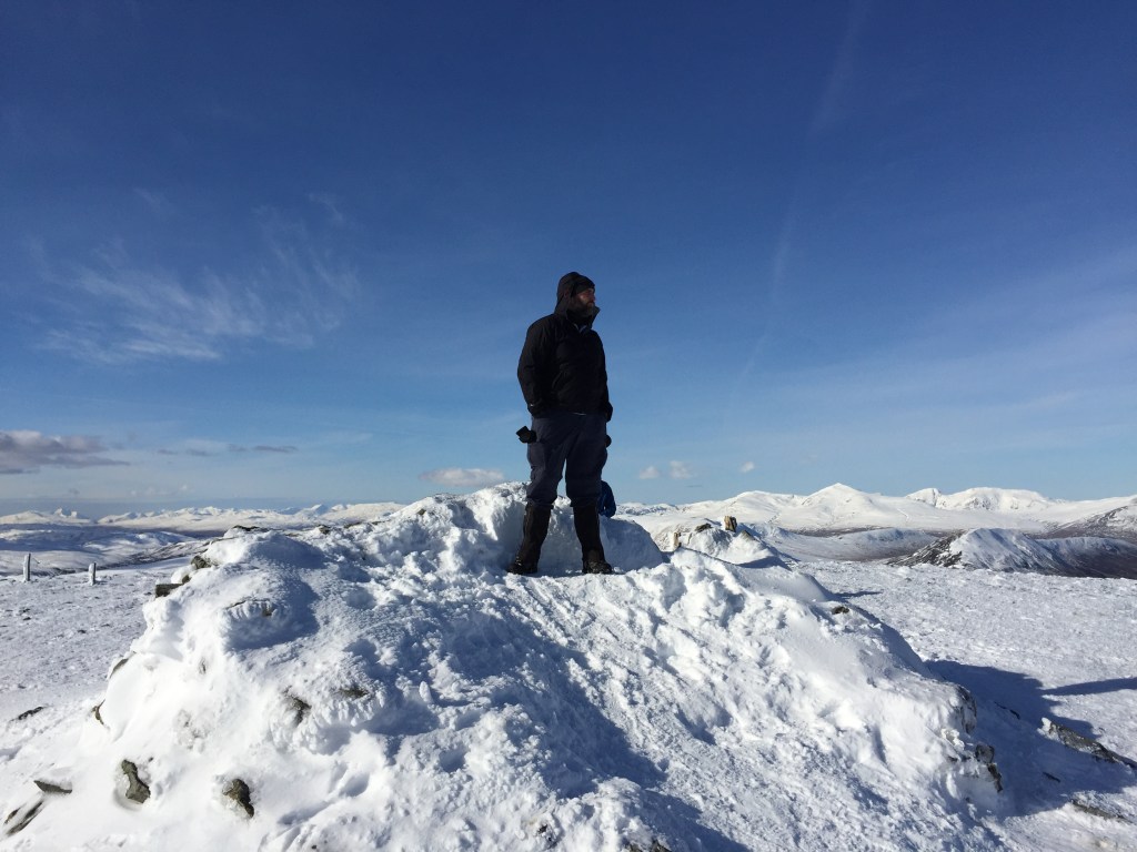 It didn’t feel like harmony as the snow blew at me from every direction, in spite of the stone structure I was crouched behind. At 931m, Ben Chonzie was giving me a lesson in upland weather and how she was definitely the boss today. The snow bounced off my goggles, like a thousand games of squash all taking place at once with my face acting as the vertical front wall.