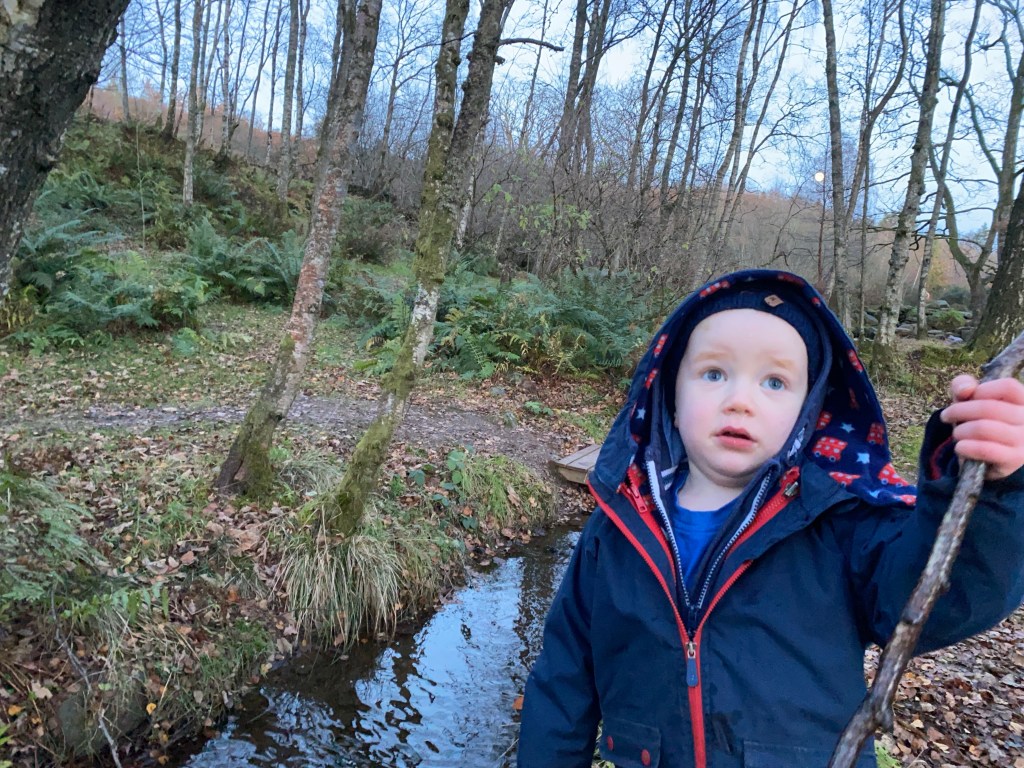 Lots of running around, picking up sticks, looking for fish in the burn and climbing trees helped us keep the cold away.