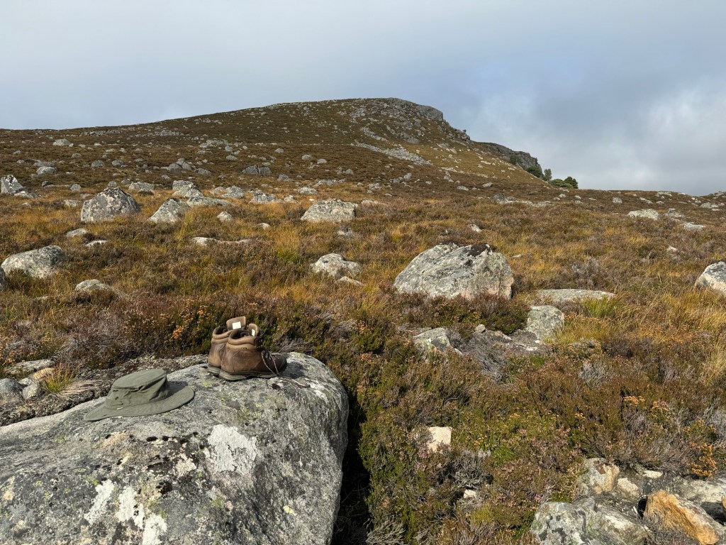But the sun started to make an appearance as I reached Feith an Laoigh. So much so that I removed my boots in celebration. I could see down into Glen Gelder, but decided to turn back for home base.