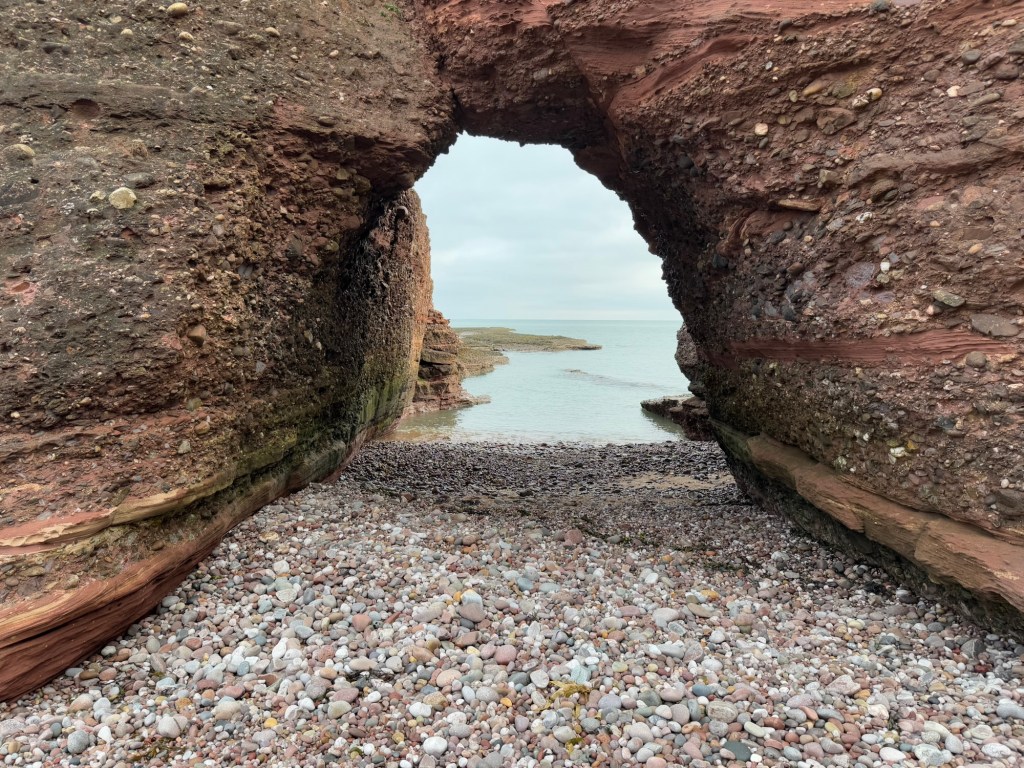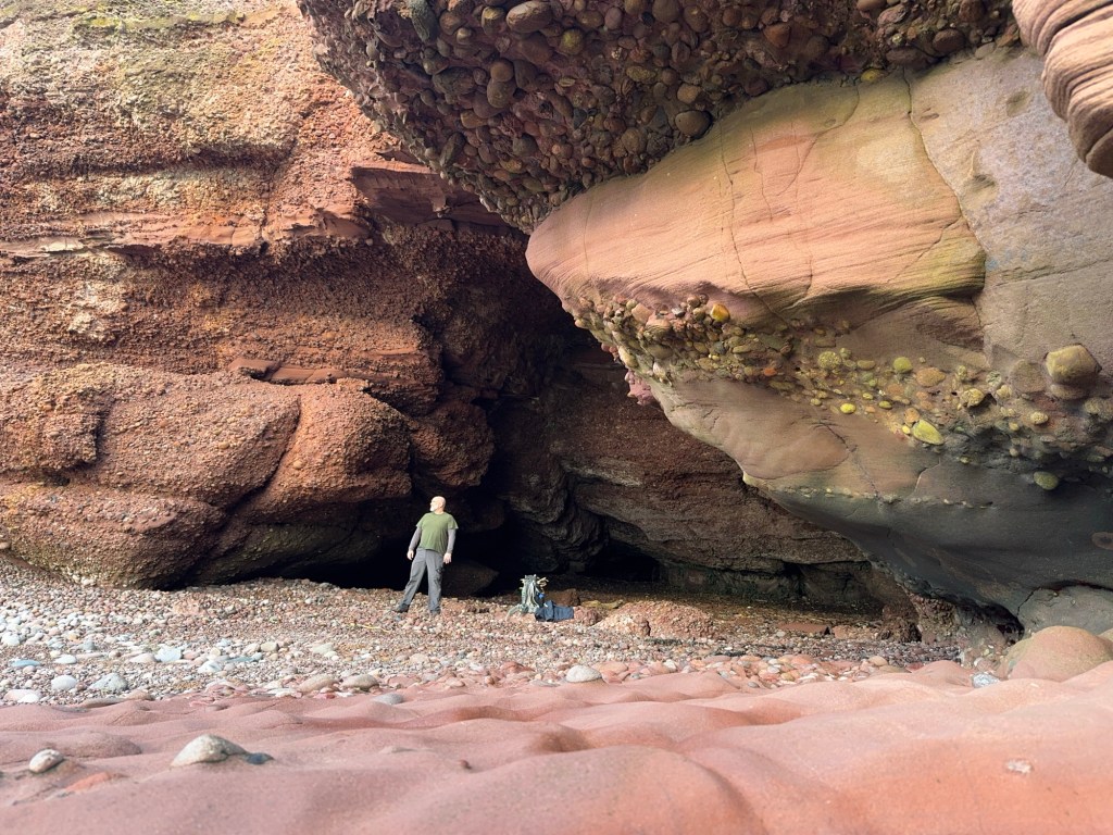 Turning left, first the stone beach was explored as I walked along. The stones were beautiful and varied in colour. The cave at this side was wide and deep with what looked like sandstone walls.