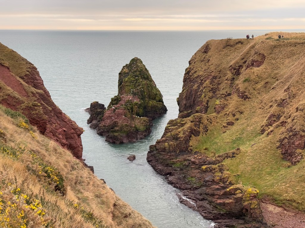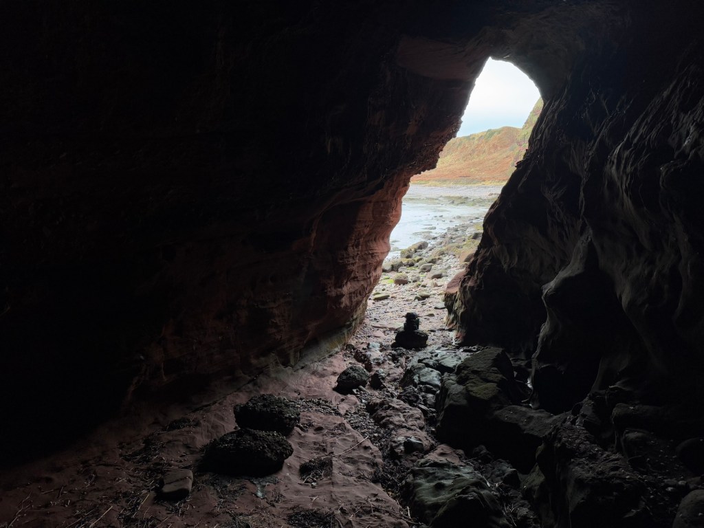 I reached Carlingheugh Bay and two more caves were marked on the map. I was disappointed at first that in the bay previously (which I couldn’t get down to due to the cliffs) had been marked what it called a forbidden cave. But it turned out that the two caves on the north of this bay pushed deep into the cliff for about 80-100m and actually came out the other side.